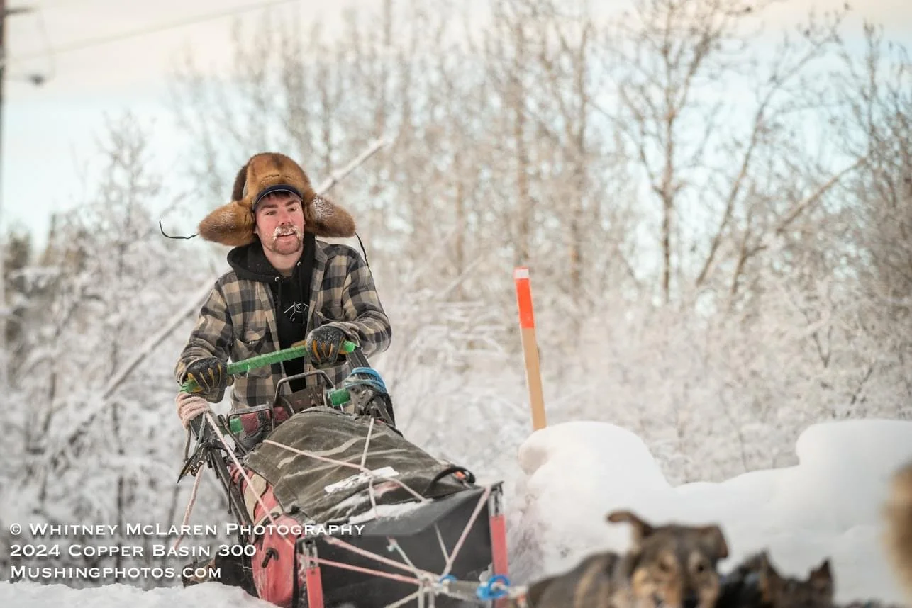 Jonah and team leave the start line at the 2025 Copper Basin 300 dog sled race.